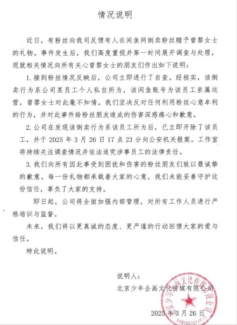 曾黎工作室发布声明,称倒卖行为系某员工私自操作,其亲属运营涉事闲鱼账号,曾黎本人完全不知情。工作室已开除涉事员工,并于3月26日17:23向公安机关报案,承诺追究法律责任。同时,工作室向粉丝致歉,承认“未能守护信任”,并宣布加强内部管理。